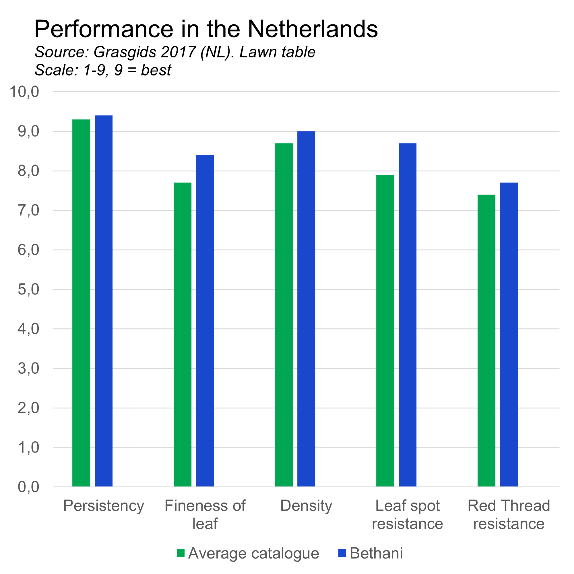 The average Smooth stalked meadow grass is not very fine leaved, but BETHANI is now the most fine leaved variety on the list! The very high density and narrow leaves opens the door for use in parks and home lawns where a high visual merit is important.