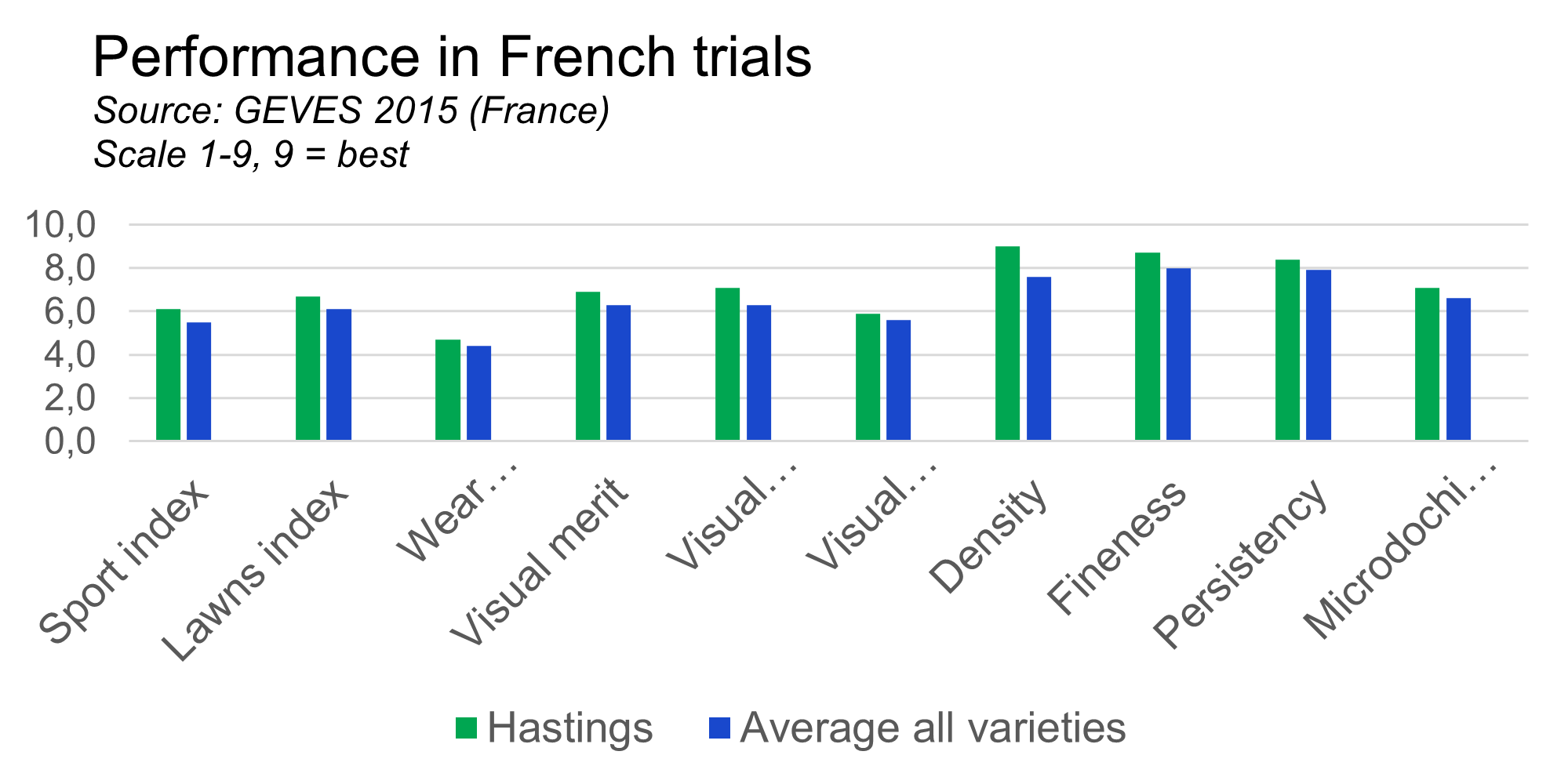 In the official French results, Hastings tops the list for both the Sport and the Lawn index. This is also showing in the winter and summer aspects, ensuring a year round high performance.