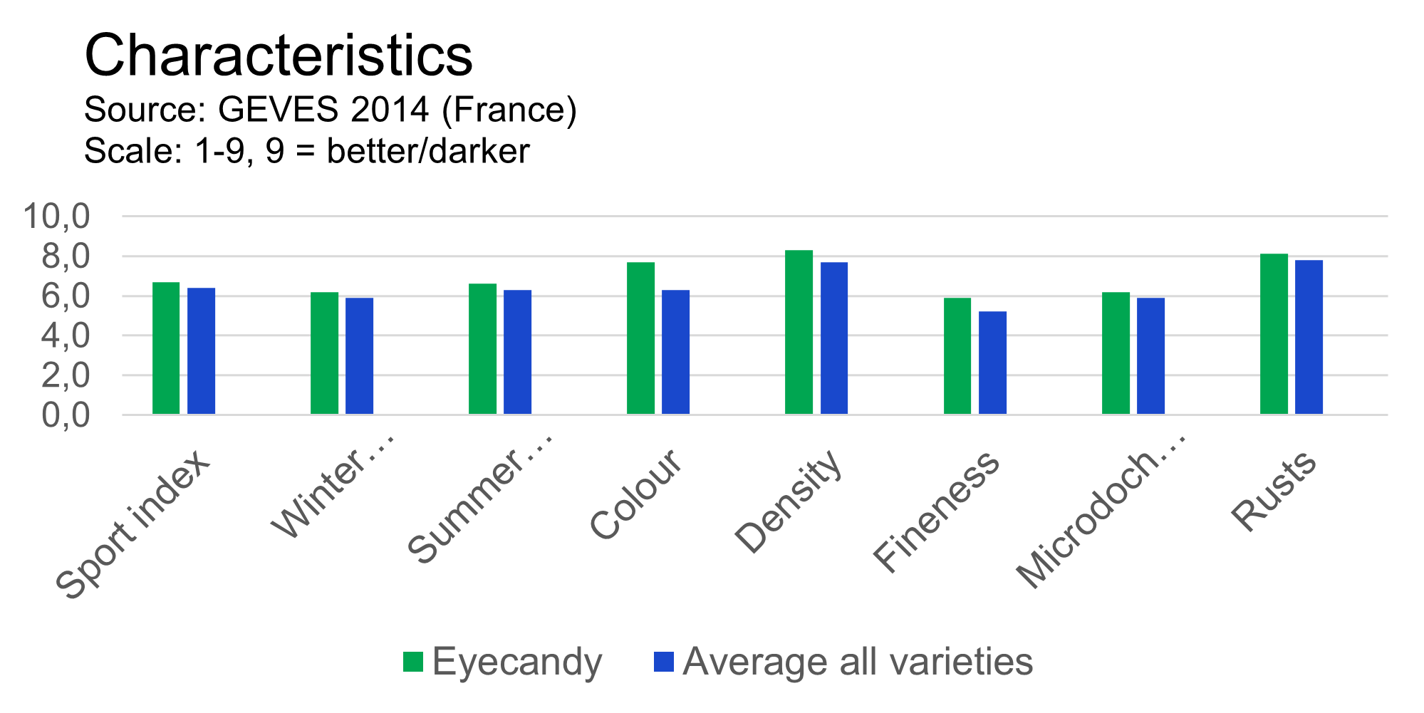 Eyecandy is very high ranked for the basic features needed for visual merit of turf grasses: Density and fineness of leaf.