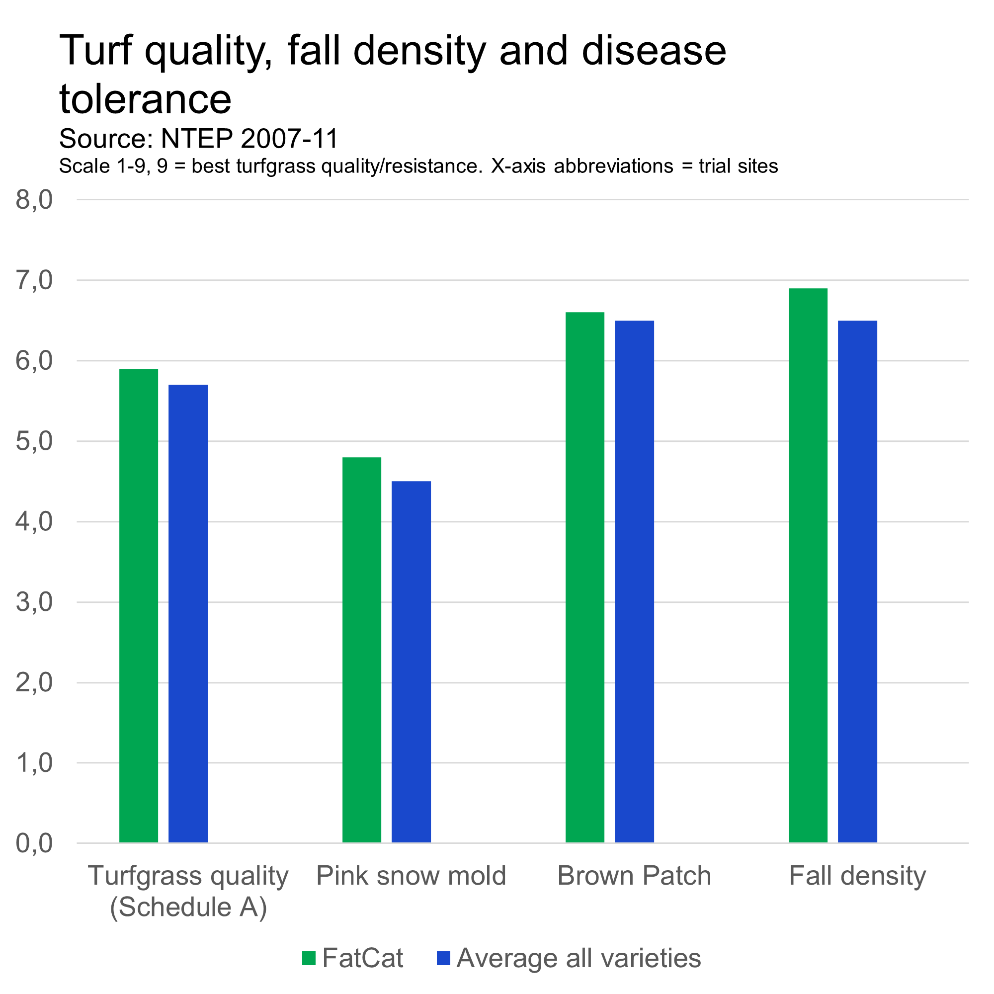 FatCat has shown good tolerance to brown patch and also tolerance to pink snow mould in NTEP 2007-11 data.