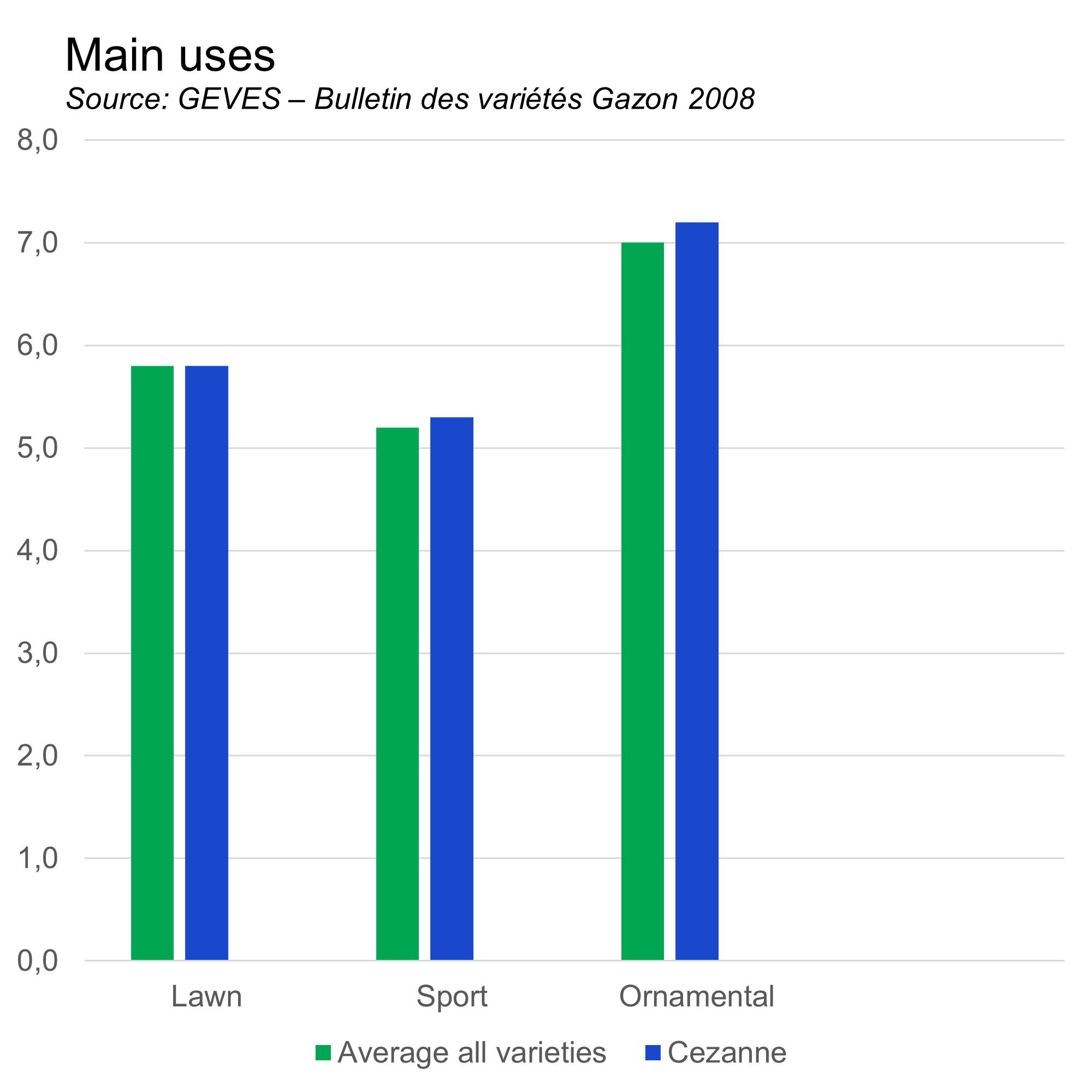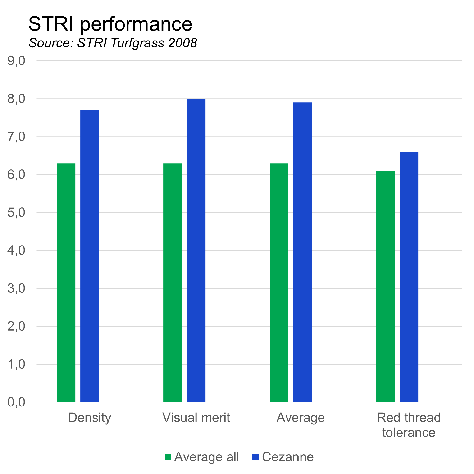 The good performance is again and again proven in STRI trials where it is top ranking, and from results of official trials in France and Germany. In 2007 Cezanne also joined the Danish list.